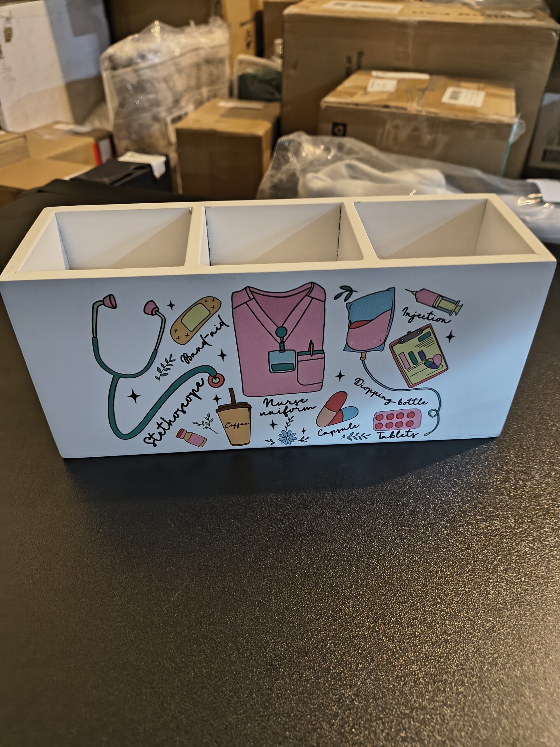 Bring order and inspiration into any nurse’s workspace with this 3-compartment nurse theme desk organizer. Designed to hold pens, badge reels, scissors, small supplies, and more, this organizer has three separate compartments so everything stays accessible and tidy during busy shifts. Its size is compact enough for a desk, nurse’s station, or bedside table, yet roomy enough to keep essentials within arm’s reach.